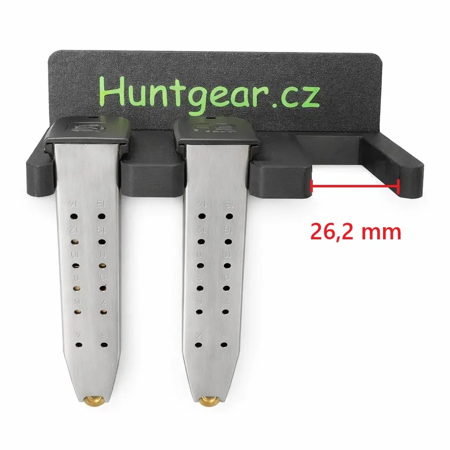 Magnetický držák zásobníků HUNTGEAR.CZ pro uchycení na trezor či jiný kovový povrch. Drážka: 26,2 mm. Např. pro Scorpion EVO 3 v ráži 9mm Luger, Glock 30S v ráži .45 ACP.