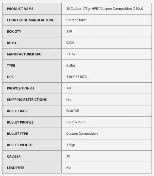 Střely Nosler Custom Competition HPBT .30 Cal., dia .308, 175grs (250 ks)