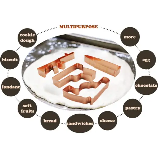Vykrajovátka na cukroví Caliber Gourmet Cookie Cutters ve tvaru patrony, pistole, revolveru a sportovní pušky. Vyrobeno z nerezové oceli a pokoveno mědí, lze mýt v myčce.